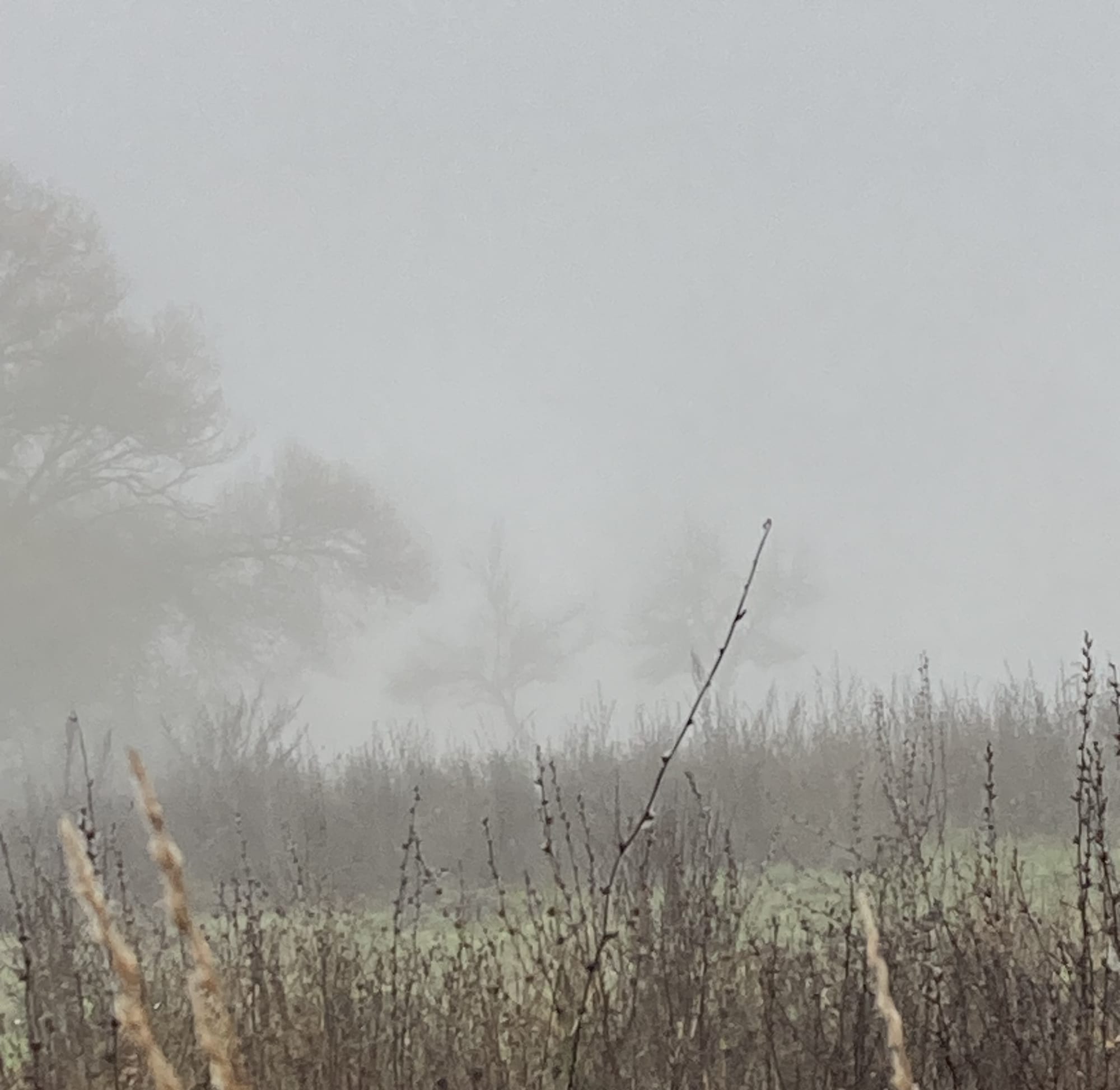 Langsam und bedächtig trotten wir in die graue Luft. Die Schemen machen der Fellnase Angst. Im Alter sieht sie nicht mehr gut und im Nebel kann sie die Dinge schlecht einordnen. Im meinem Kopf wird es auch nicht klar. Trotzdem versuche ich mich auf meine Umgebung zu Konzentrieren. Ich entdecke Farben. Ein Busch mit roten Stängeln und unterschiedlich gefärbten Blättern. Mir ist es heute zu unangenehm draußen zu malen. Also mache ich ein Bild. Vielleicht wird es später noch was.