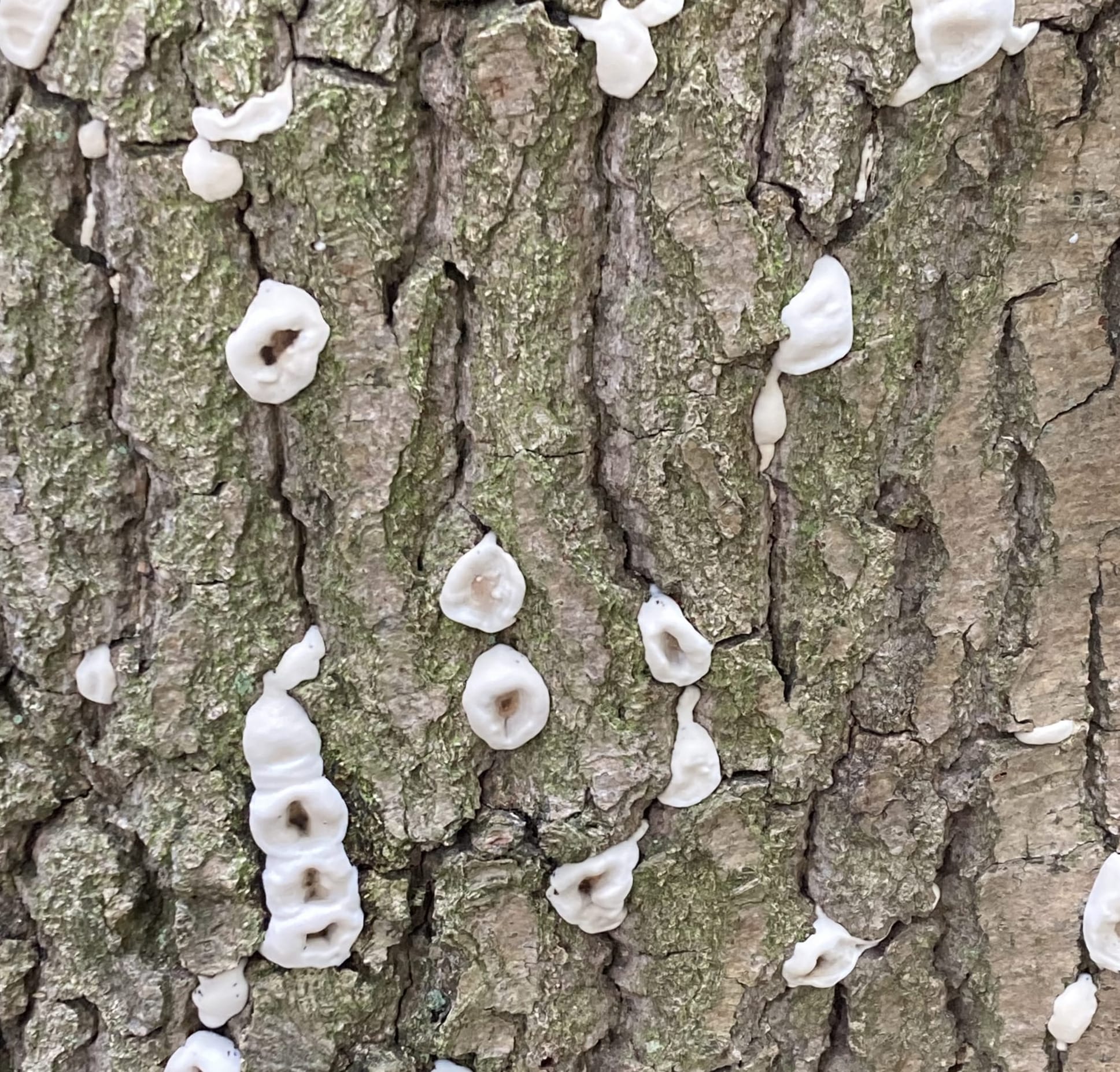 Irritiert bleibe ich an einem Baum stehen. Sieht aus als hätte jemand lauter Kaugummi an die Rinde geklebt. Als ich näher hinschaue, merke ich, dass es lauter kleine Baumpilze sind.