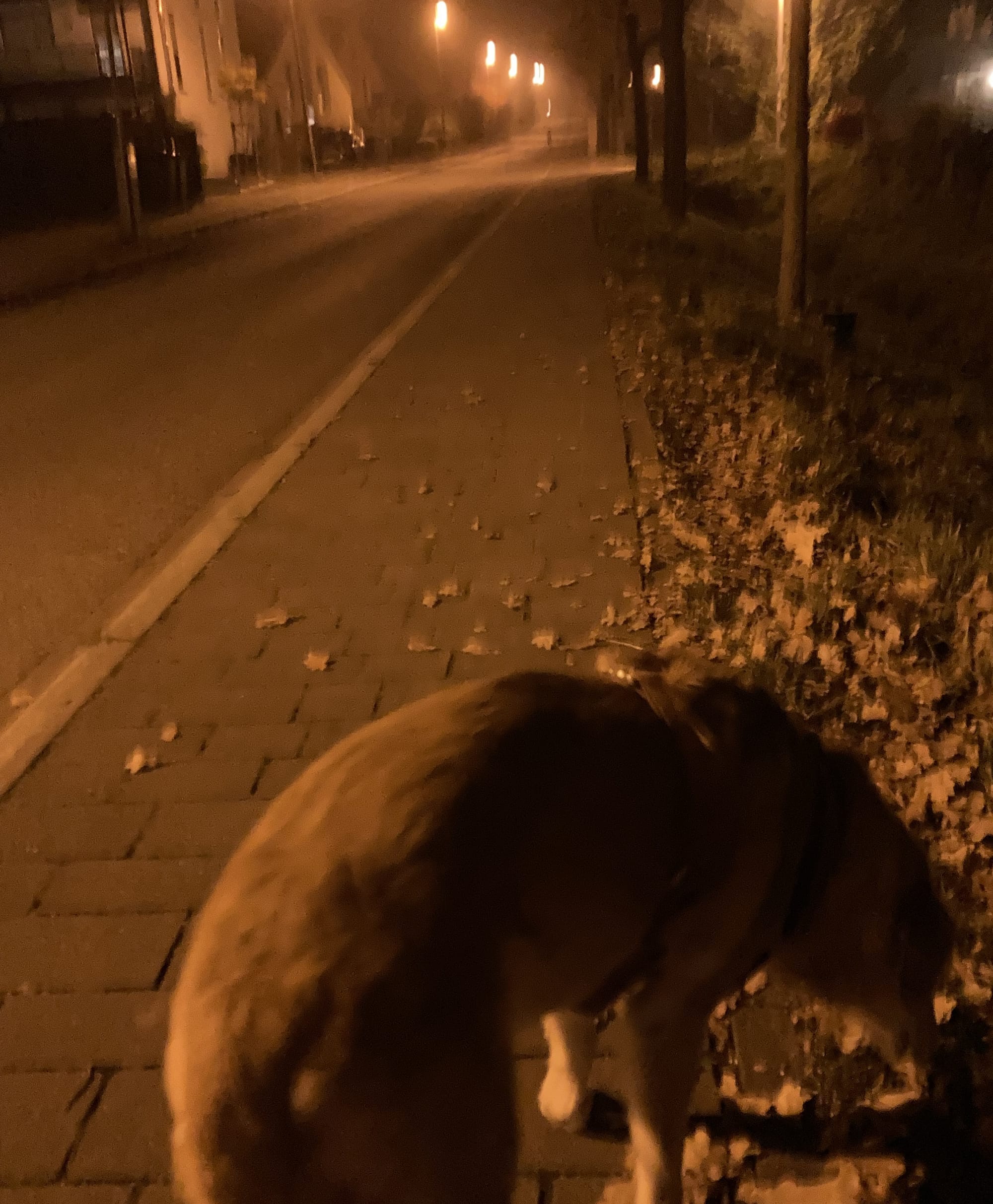 Den Abschluß bildet der Abendspaziergang mit der Fellnase. Wieder bin ich verfroren. Das kenne ich so gar nicht von mir. Draussen ist es ruhig. Der leichte Nebel gibt mit den Straßenlaternen ein diffuses Licht. Ich höre die Geräusche die wir machen. Jedes Aufsetzen meiner Schuhe, das Tapsen der Hundepfoten. Meine Jacke die ein reibendes Geräusch macht wenn ich die Arme bewege. Das Klicken der Leine am Geschirr. Dann das Rascheln der Blätter unter den Füßen. Im Lauschen wieder ein Moment des ganz bei mir seins. Vor der Haustür begrüßt uns das Flackern der Kerze mit ihrem warmen Schein und ich lächle. Jetzt bin ich mit dem Tag doch noch im Reinen.