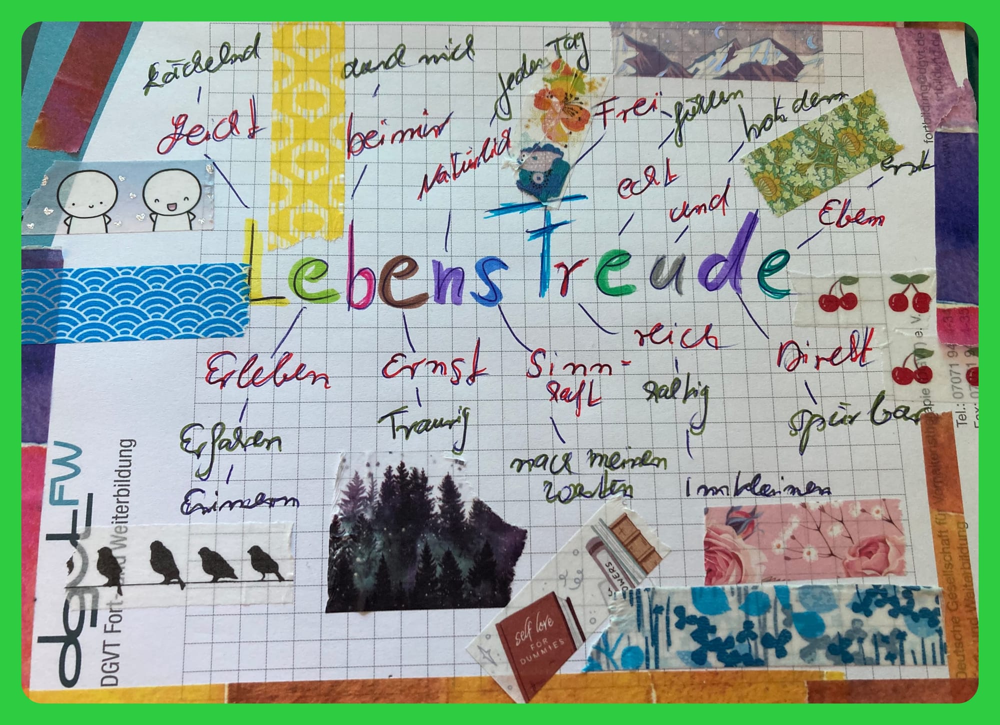 Es hat Spaß gemacht, ich habe mich spontan für Begriffe entschieden und es dann noch mit Washitapes unterlegt. Der Prozess hat mir klar gemacht, dass in Lebensfreude auch Momente stecken, in denen das Leben traurig sein kann und es schwer ist, was anderes zu sehen.