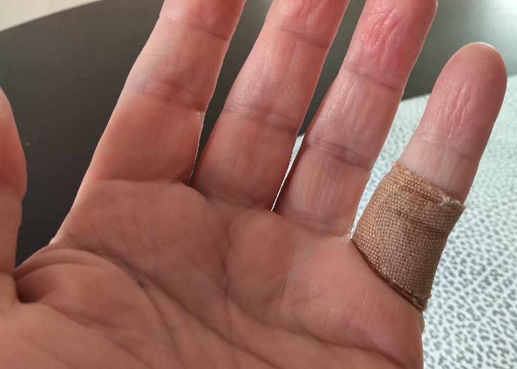 Verflixt, ich wollte doch achtsam sein. Also Finger unter kaltes Wasser und dann Pflaster drüber.