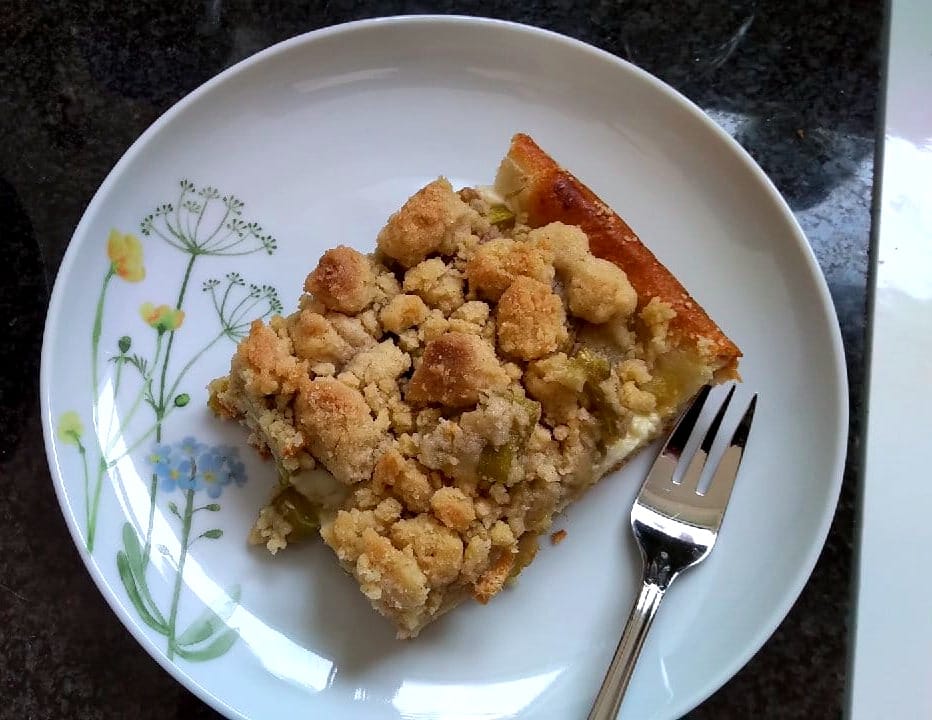 Nach den Essen freue ich mich darauf den Kuchen fertig zu machen. Der vorbereitete Teig lässt sich leicht ausrollen. Ob der Pudding reicht? Ersteinmal schlage ich den kalten Pudding ordentlich auf. Er lässt sich leicht verteilen und er reicht. Der Rhabarber reicht auch gerade so. Nun noch die Streusel verteilen.